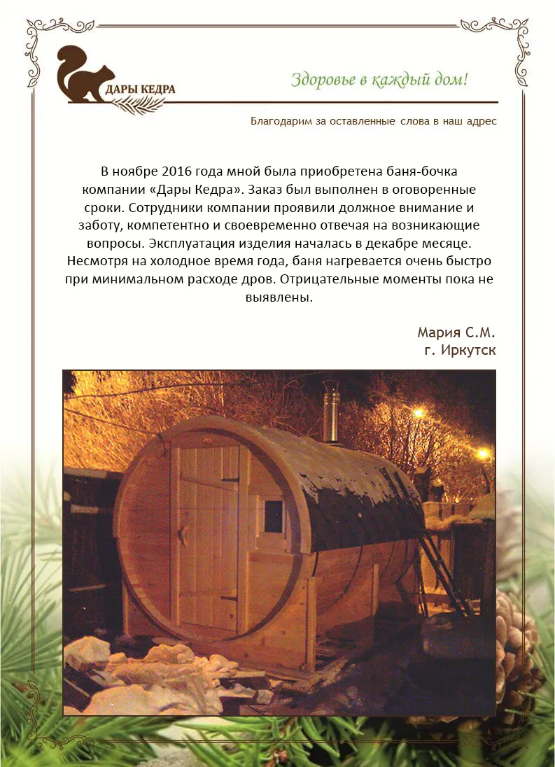 Летом 2019 года приобрела в Дарах Кедра баню-бочку, крашенную по моим требованиям. С заказом справились в срок, документальная часть меня порадовала - всё очень добросовестно, по договору. Доставка и установка, а также подключение бани было сделано сотрудниками компании. Спасибо!