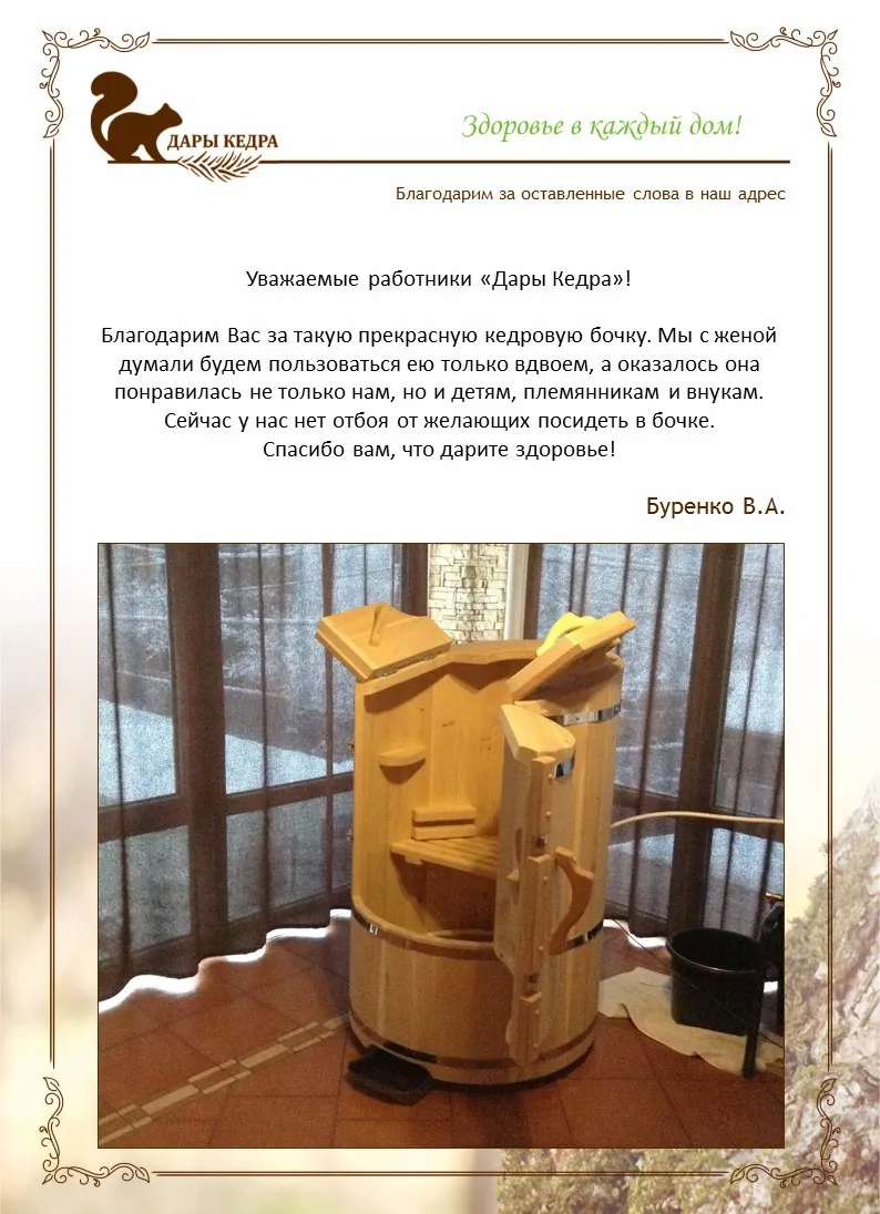 После изнурительных тренировок бочка «Дары Кедра» - настоящее спасение! Моя бочка с резьбой выглядит очень красиво! Практически каждый день пользуюсь после занятий, эффект есть, боли в мышцах уходят. Рекомендую!