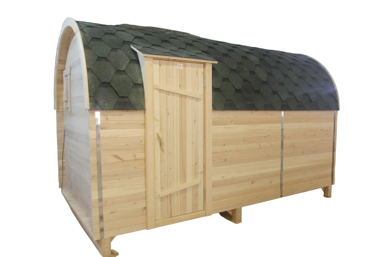 Баня-буханка более просторная за счет увеличенной высоты потолков и ровного пола. Козырек не только украшает баню, но и защищает оставленную обувь от дождя. Лавочки из кедра находятся по всей длине бани-бочки с обеих сторон. Печь расположена в парилке около дальней стены. Время растопки такой бани не превышает 30 минут. В зависимости от выбранного размера баня-бочка буханка с козырьком имеет следующую комплектацию: