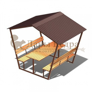 Беседка выполнена из стальной квадратной профильной трубы 40х40 мм. Лавки и стол обшиты кедровой доской. На крыше - ондулин. Беседка отличается простотой в установке, легкостью конструкции, долговечностью, прочностью и классическим дизайном, который впишется в любой интерьер приусадебного участка. Вокруг такой беседки можно организовать ландшафт из вьющихся растений, которые красиво создадут зеленые "стены" снаружи и уют внутри. Размер стола у разных моделей варьируется в зависимости от ширины конструкции.